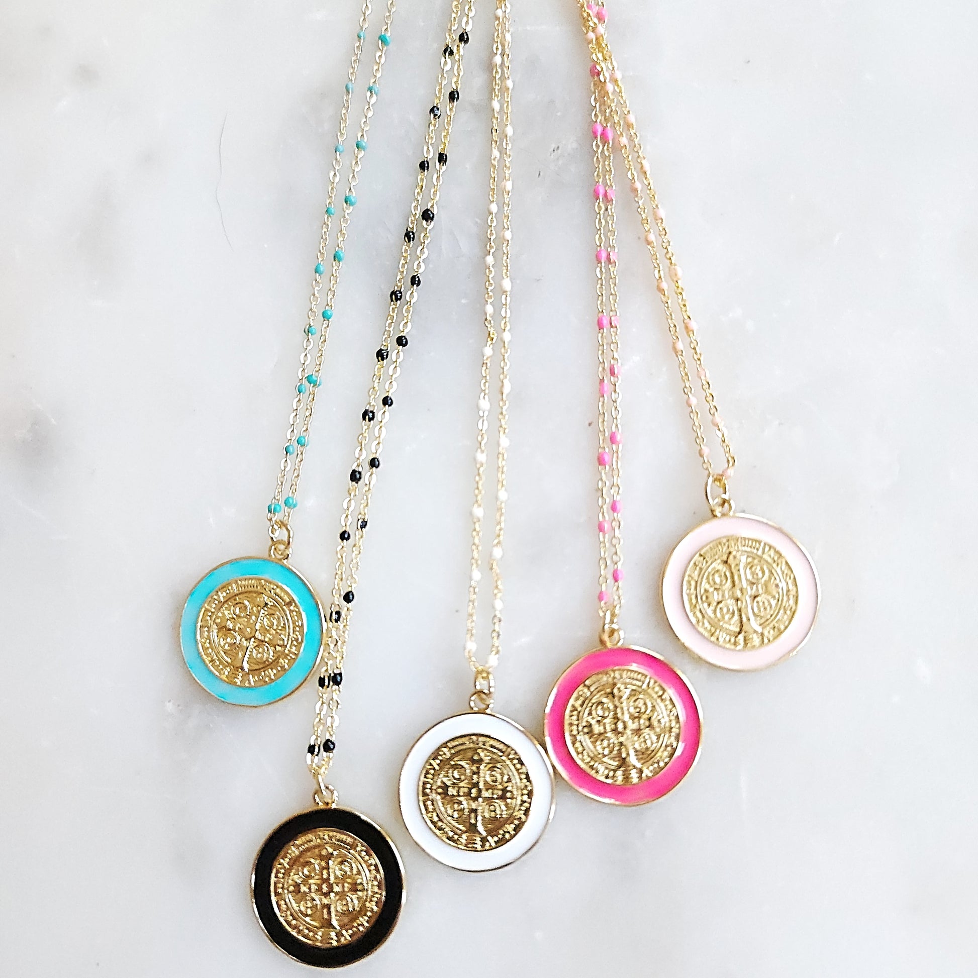 A pop of color always makes an outfit stand out! Pick your favorite color these quarter-size coins that have the Benedictine cross on them surrounded by an enamel color hangs off of a beautiful delicate beaded necklace—measuring 16 inches. Being blessed is beautiful and what we are with the love of God.