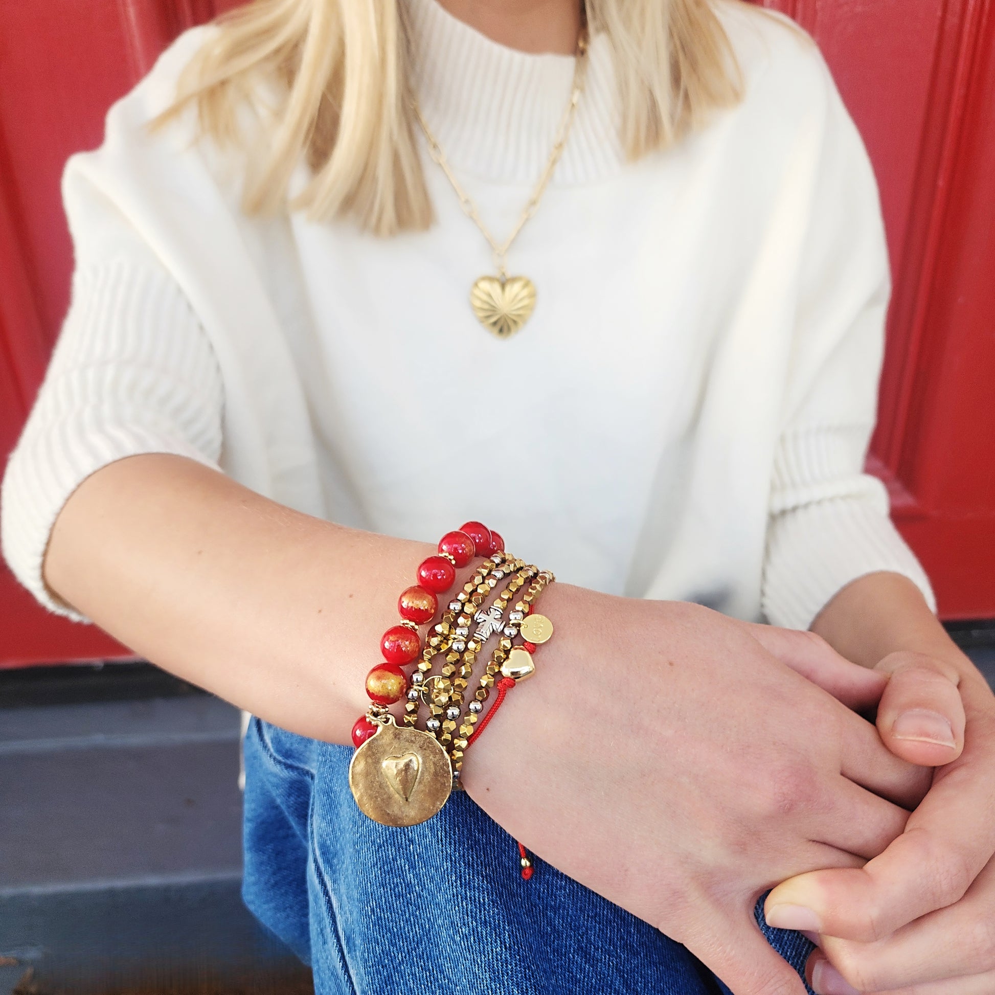 Merry is a show-stopping stretch bracelet combining dazzling red and gold beads with sturdy brass cross charm accents plated in real 18kt gold. Show off your faith in style with the beautiful gold cross bead featuring a crystal center.