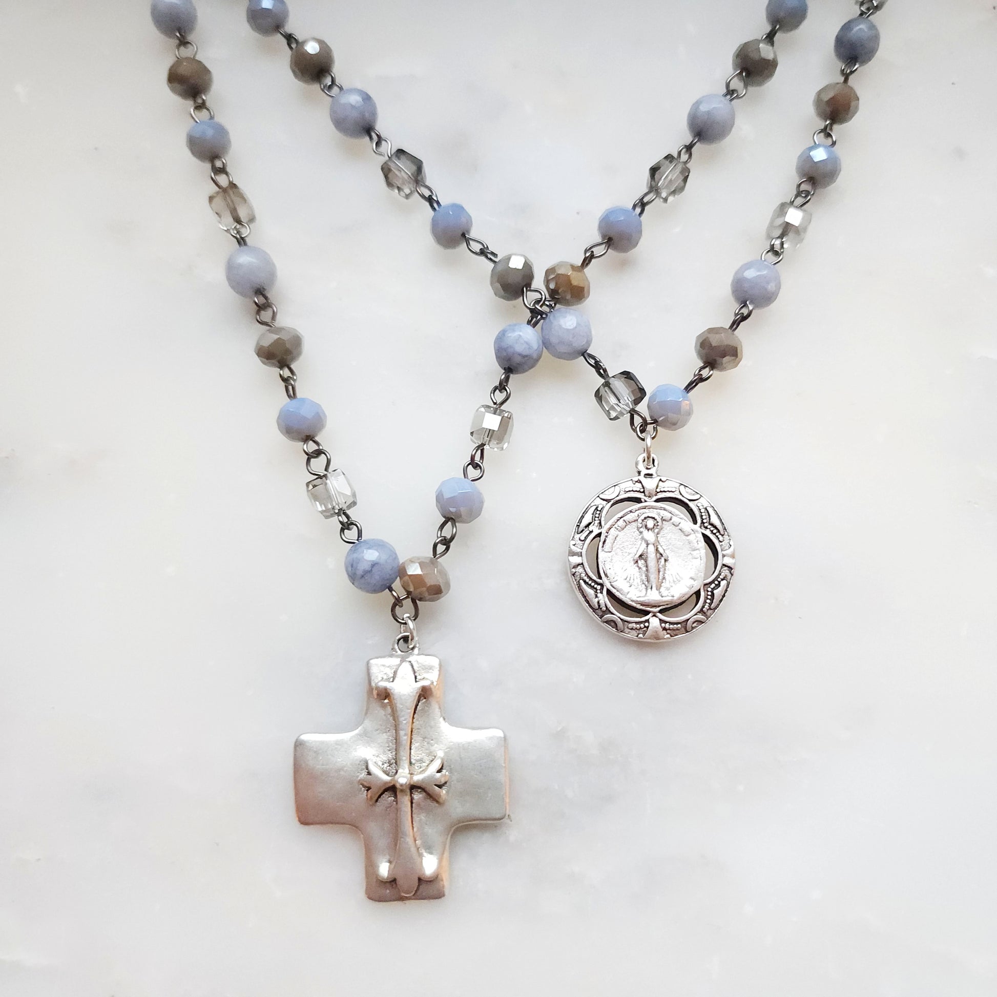 This necklace is as distinctive and graceful as you are! Measuring 16 inches, it features exquisite handcrafted beads and a square crystal rosary chain, complemented by a 1.5-inch extension chain. Choose between a stunning Mary pendant or a Cross to personalize your look.