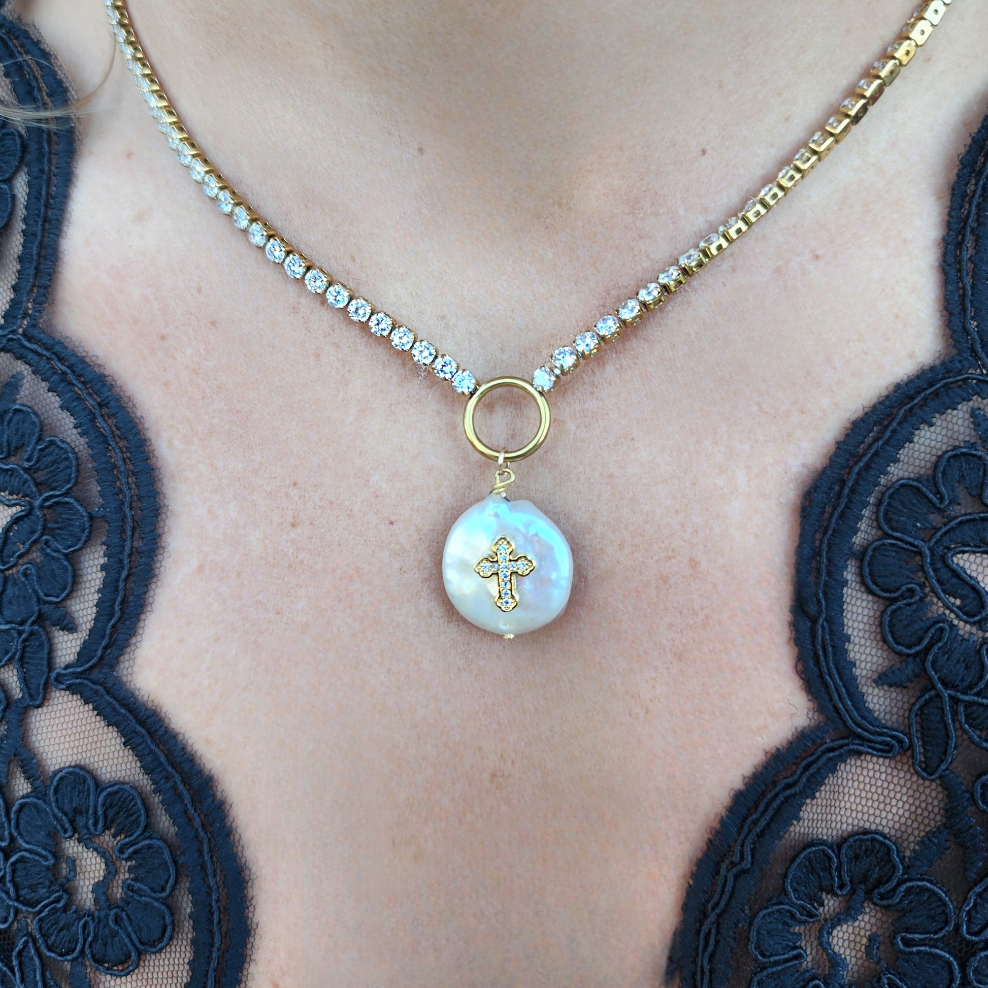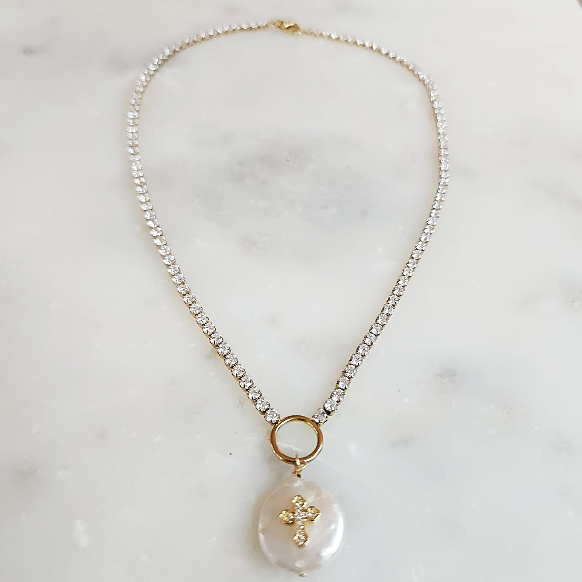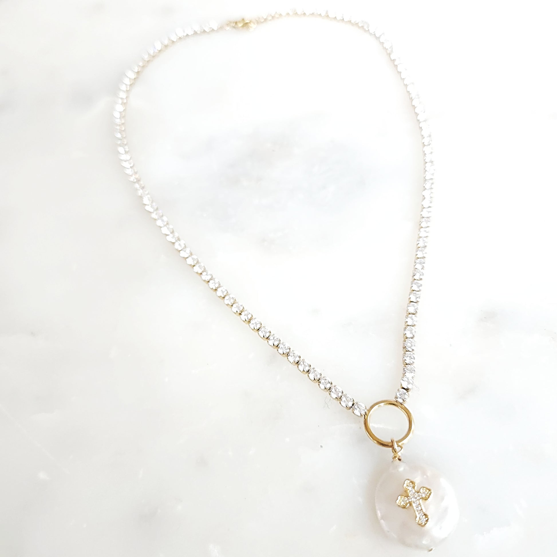 Embrace divine elegance with the Radiance Choker, a stunning crystal necklace designed to celebrate your faith. This exquisite piece features a luminous mother of pearl charm has a crystal cross at its heart, creating a captivating focal point that catches the light beautifully. At approximately 16.5 inches, it's the perfect length for a refined, close-to-neck style. Every charm is uniquely crafted, ensuring your necklace is truly one-of-a-kind in both shape and size. Let this radiant symbol of spiritual devotion become your everyday reminder of grace and inner light.