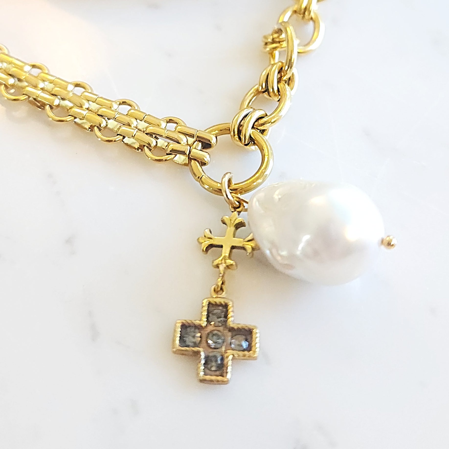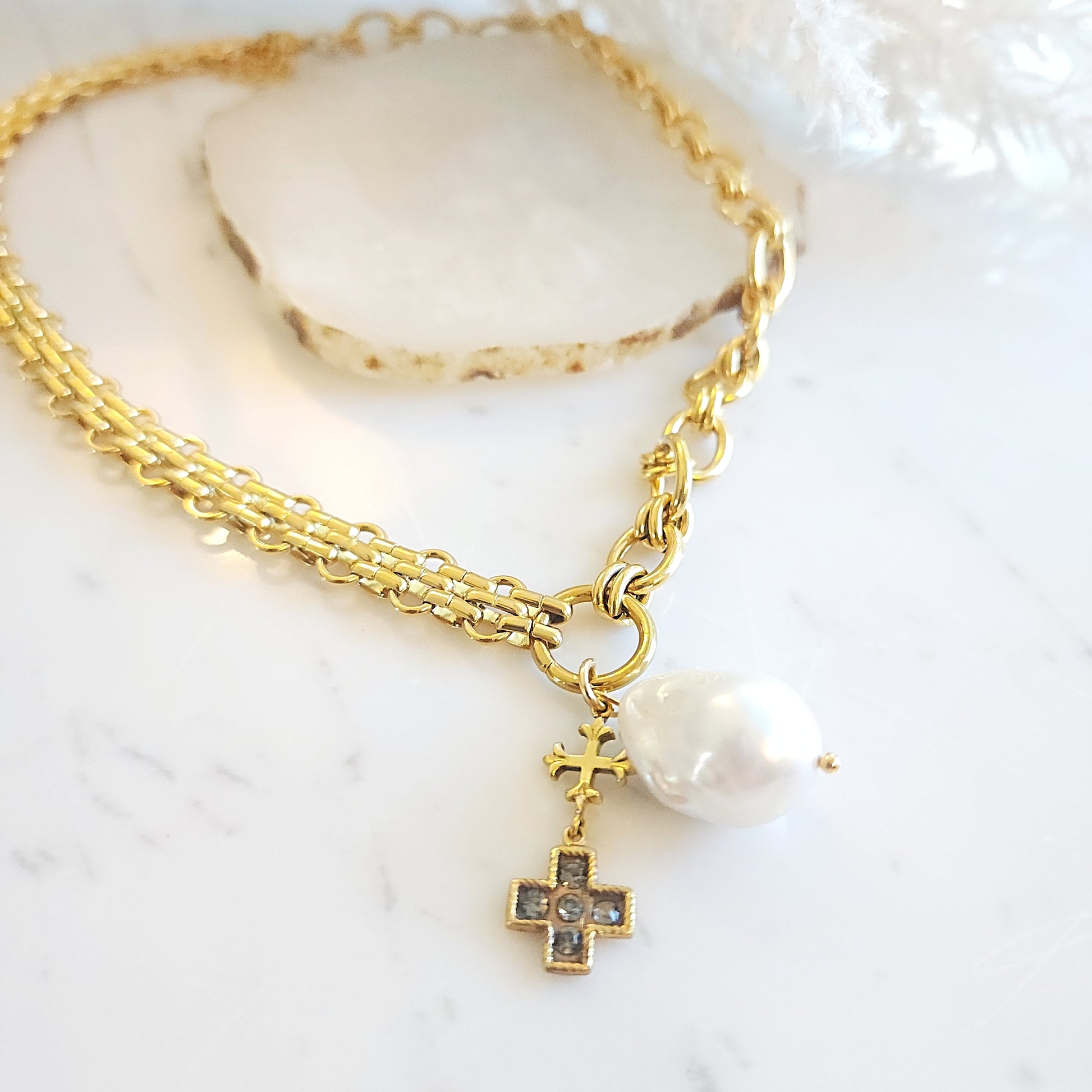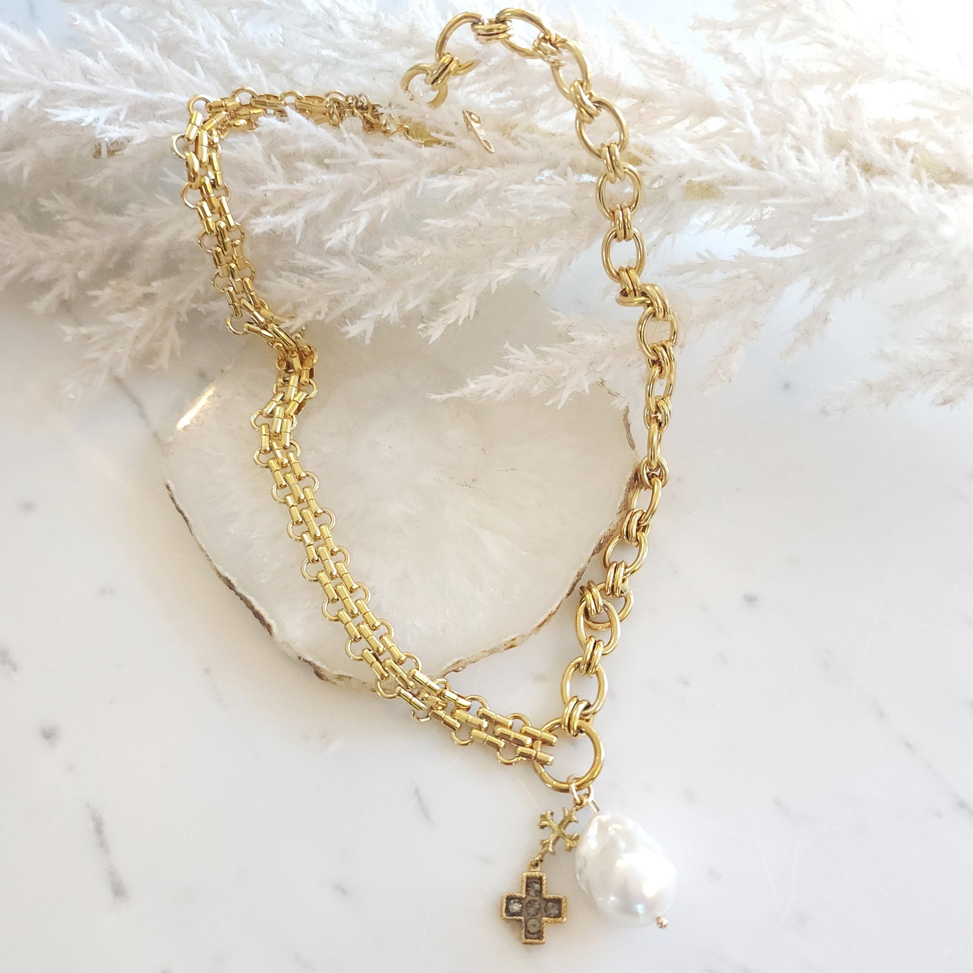 Pause for a moment and remember that God is our protection. Marvel at this dazzling double-chain choker! Its square shell and stunning cross come in gold with a long-lasting tarnish-resistant coating. Distinguish your look with the detachable shell pearl and add one of our captivating enhancers. Plus, it's easy to put on or take off with the convenient back clasp!
