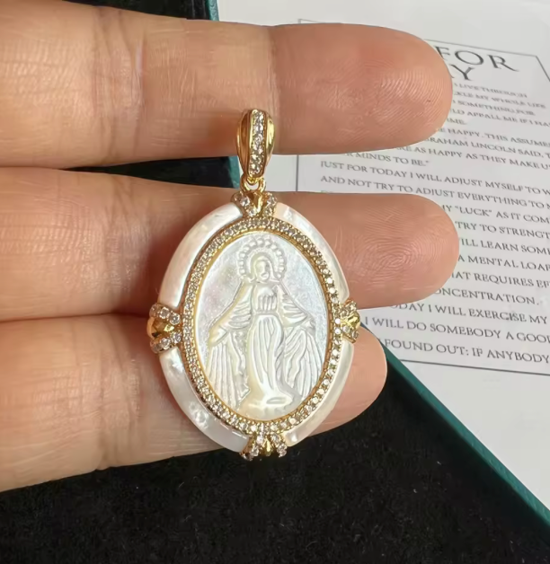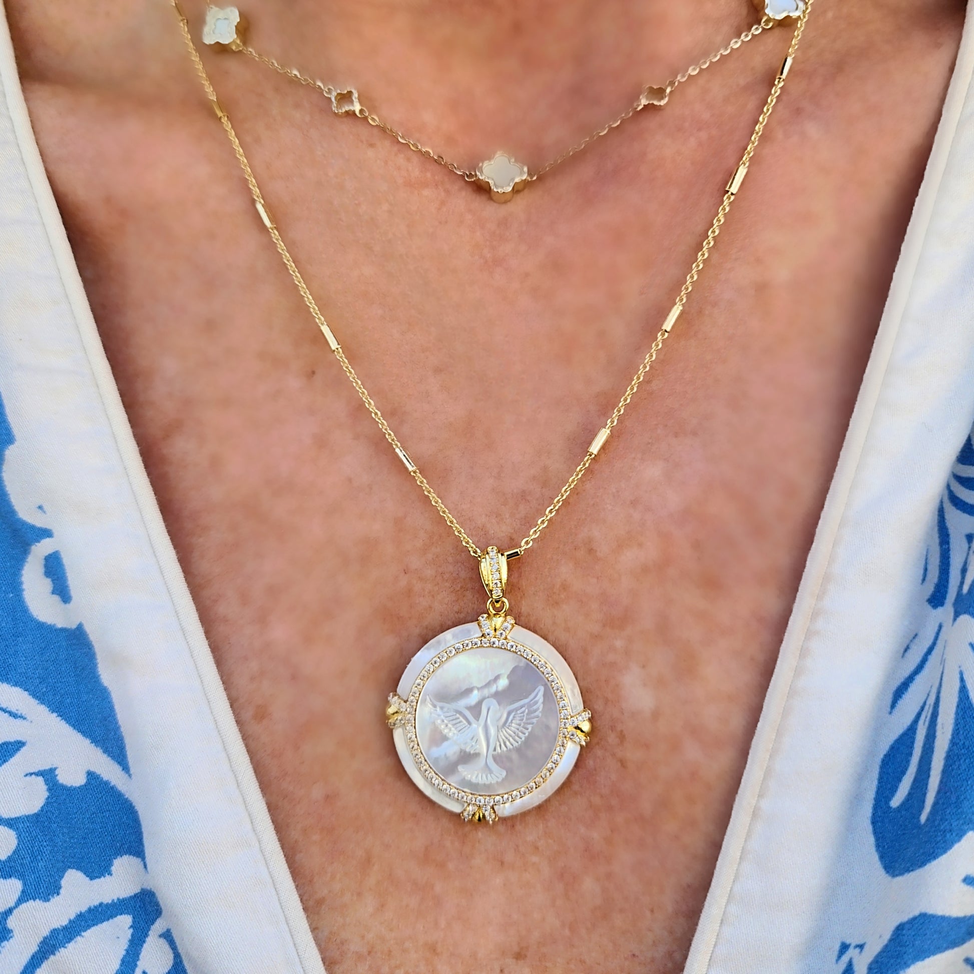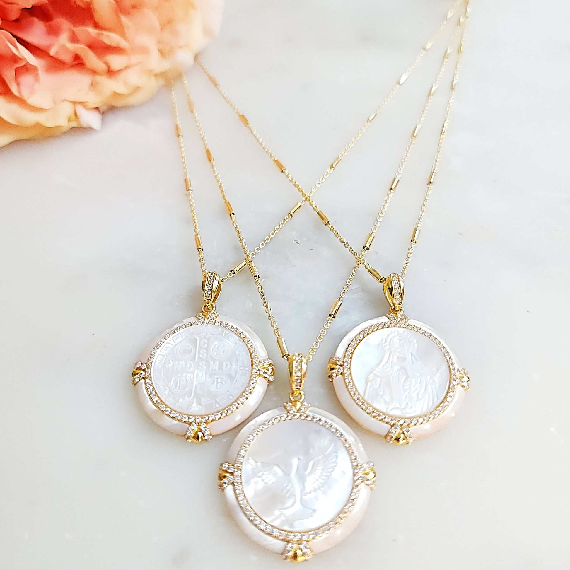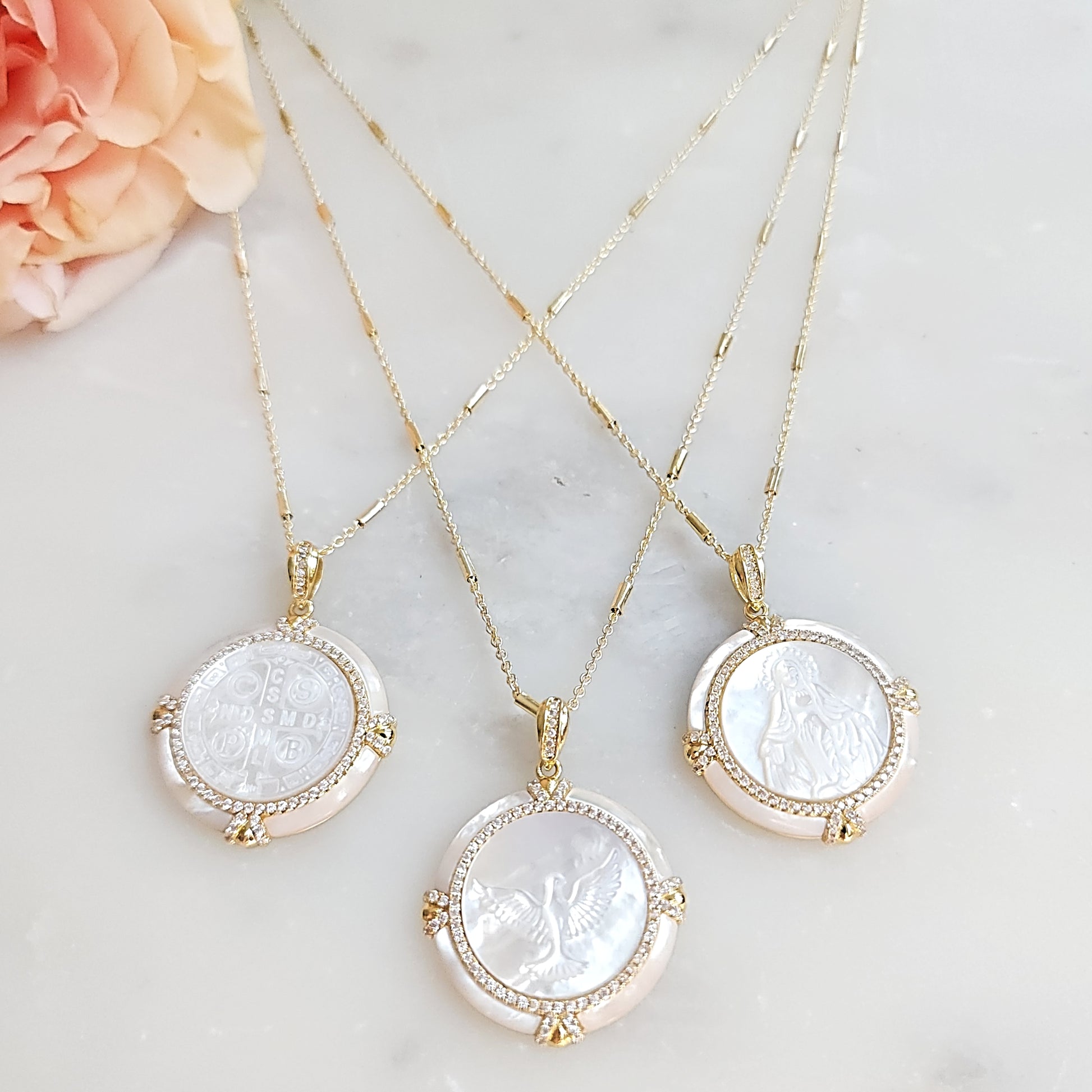 Elevate your faith with the Eternity necklace an 18" with a 2 inch extension chain is 22k gold-filled, featuring a barrel satellite chain and your choice of three meaningful pendants: Holy Spirit dove, Fatima, or Tree of Life. Each pendant showcases natural mother-of-pearl with intricate embossing, accented by sparkling crystals that catch the light beautifully. A timeless expression of spiritual devotion of knowing the eternal life Christ has given us.