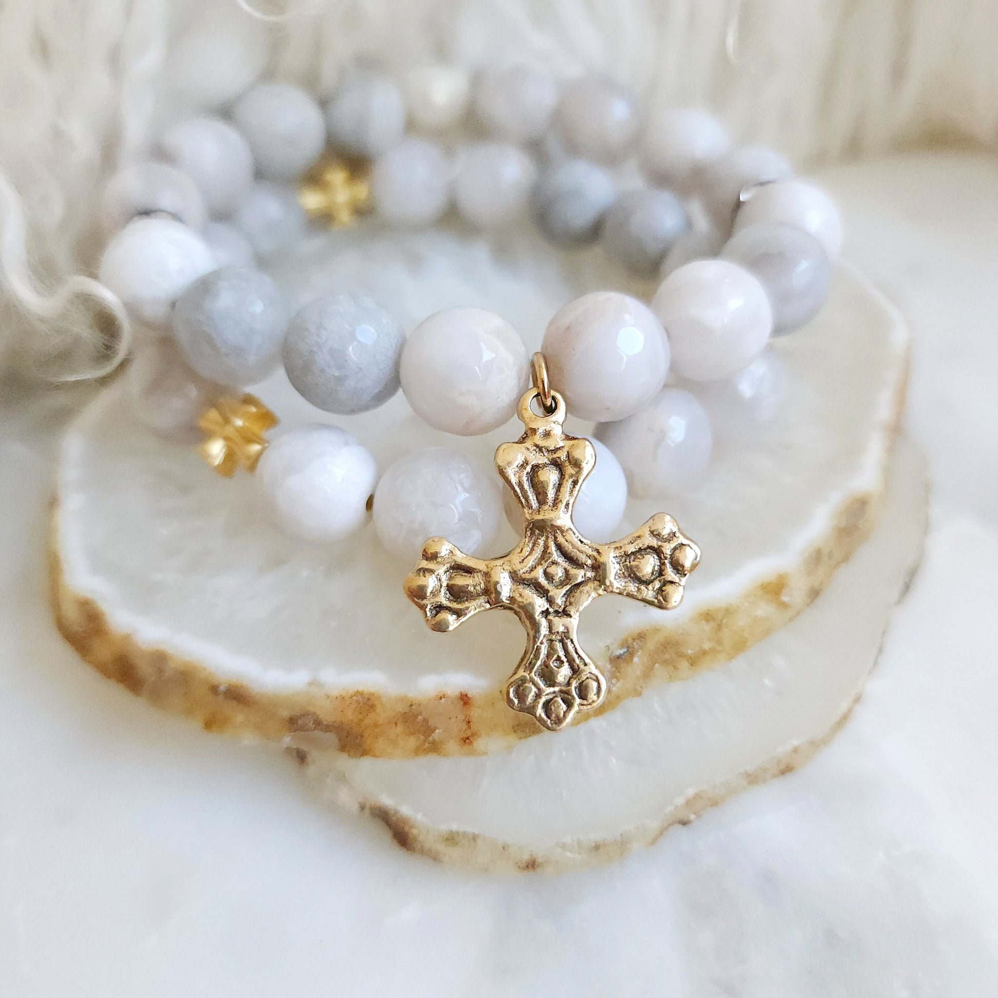 These stunning hand-crafted stretch bracelets of 12mm white mystic silver agate beads will add a dash of dazzling style to any outfit. Our Give Thanks triple bracelets are beautiful either stacked together or worn singly.