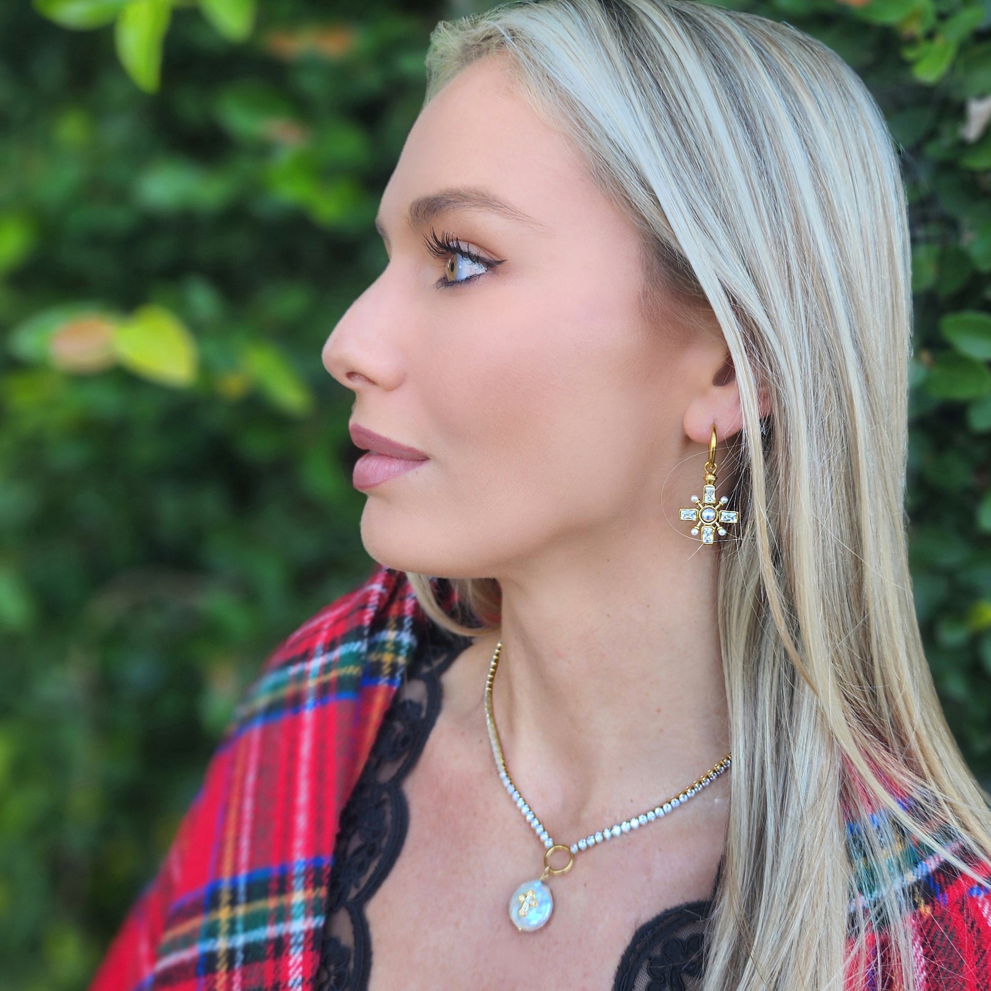 These vintage-style cross earrings feature dazzling clear rhinestones that catch the light beautifully. Made from waterproof stainless steel with a gold finish, each earring measures about 1 inch from the earlobe. Complete your ensemble by pairing them with the Light of the World necklace. The radiant rhinestones symbolize the brilliance of Jesus, capturing the essence of the Light of the World perfectly..