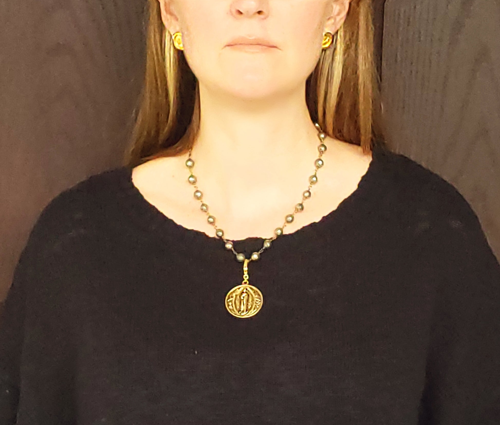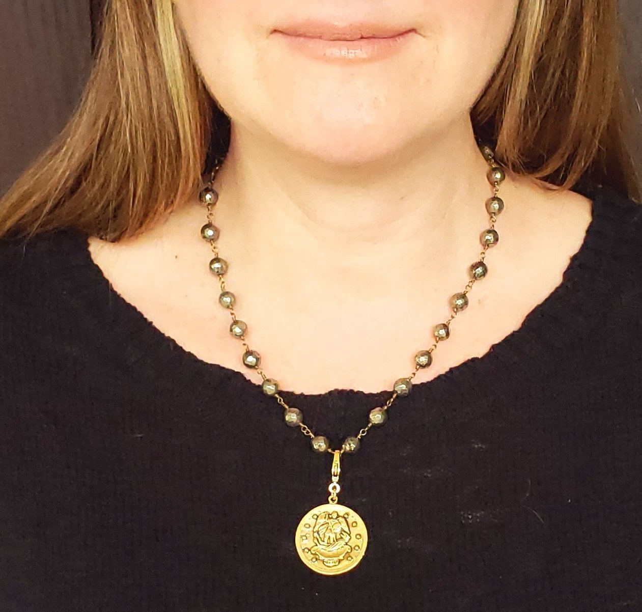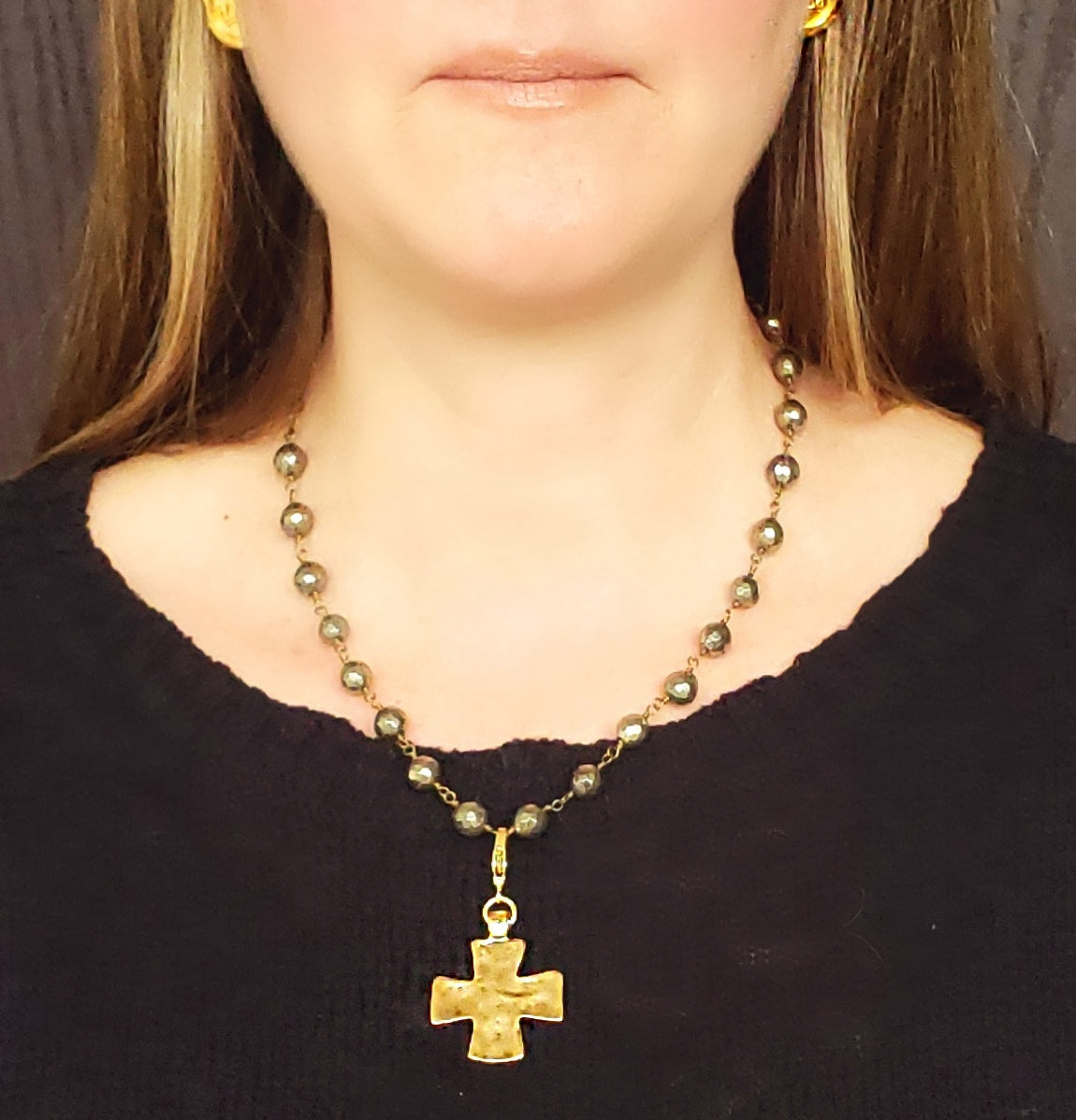 Luminary is a chain necklace made with faceted pyrite beads with antique bronze wire. A lobster clasp and extender chain increase it to your desired length (16-19.5 inches). This necklace is sold as is, but was created to be purchased with one of our enhancement charms, SHE IS Crown of Life, Pardon, Favored One or Divine Guardian. The small coordinating bronze cross which hangs from the extender chain may vary in style. You may also like to browse our Statement Necklaces and Enhancers page.