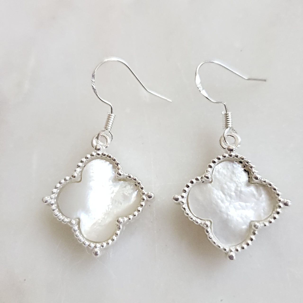 Our clover cross earring is 14k gold-filled framing around the mother-of-pearl center. The french ear-wire is 14K gold and the earring measures 1.25 inches.