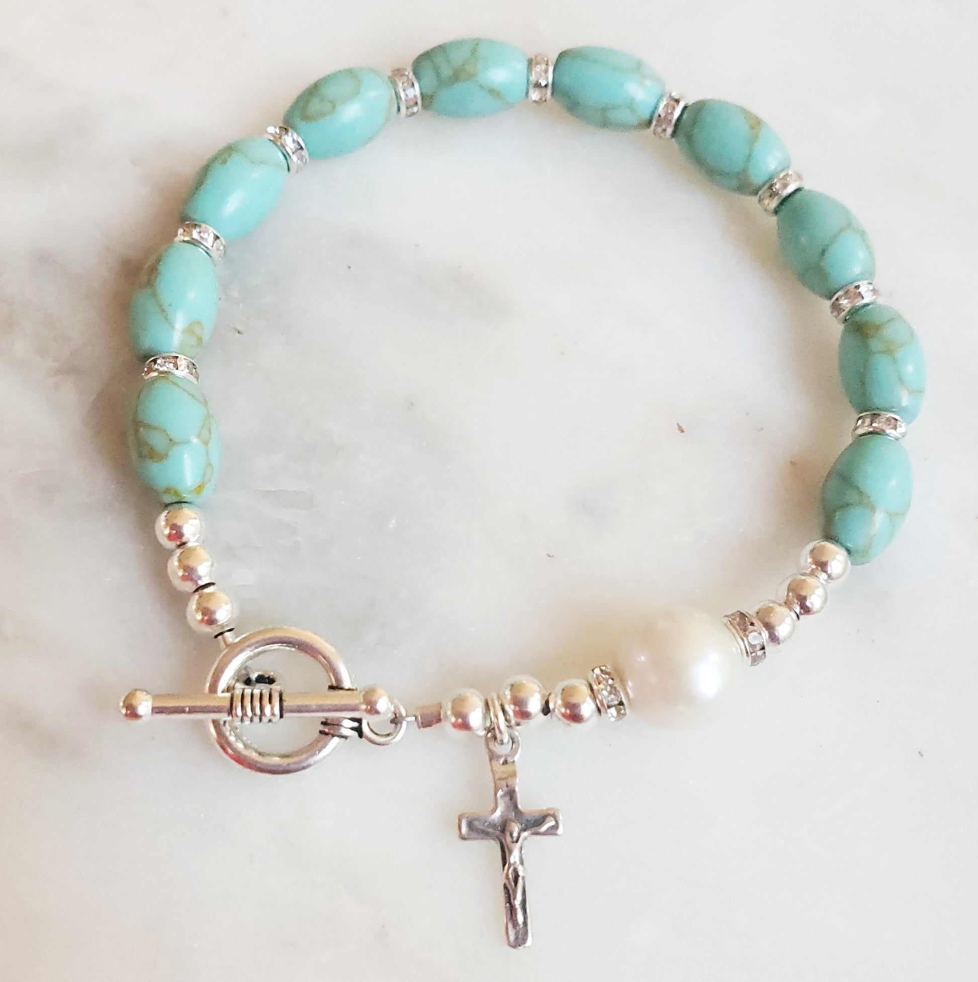 Mercy comes in the personal relationship Jesus promises to all of us: a relationship based on forgiveness and love, reconciliation and truth. This Mercy Chaplet Bracelet gives you a beautiful way to stop and say a Chaplet or even the Rosary. A chaplet is a vocal prayer and can be prayed as a petition, or in adoration, or for motives of thanksgiving, or in reparation for personal sins or the sins of the nation. This a beautiful bracelets has turquoise beads with gold and crystal seed beads in between. A beautiful toggle for easy closure. It measures about 7.5 inches including the toggle. Great gift for a special occasions or just as a reminder of Gods forever mercy.