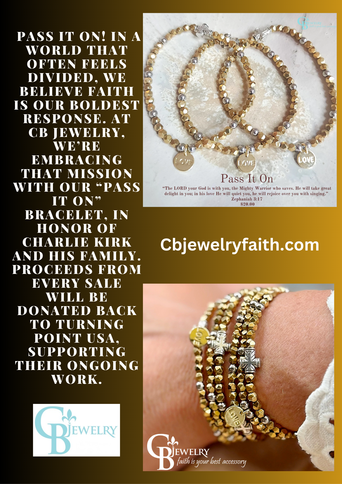 Pass It On! In a world that often feels divided, we believe faith is our boldest response. At CB Jewelry, we’re embracing that mission with our “Pass It On” bracelet, in honor of Charlie Kirk and his family. Proceeds from every sale will be donated back to Turning Point USA, supporting their ongoing work.