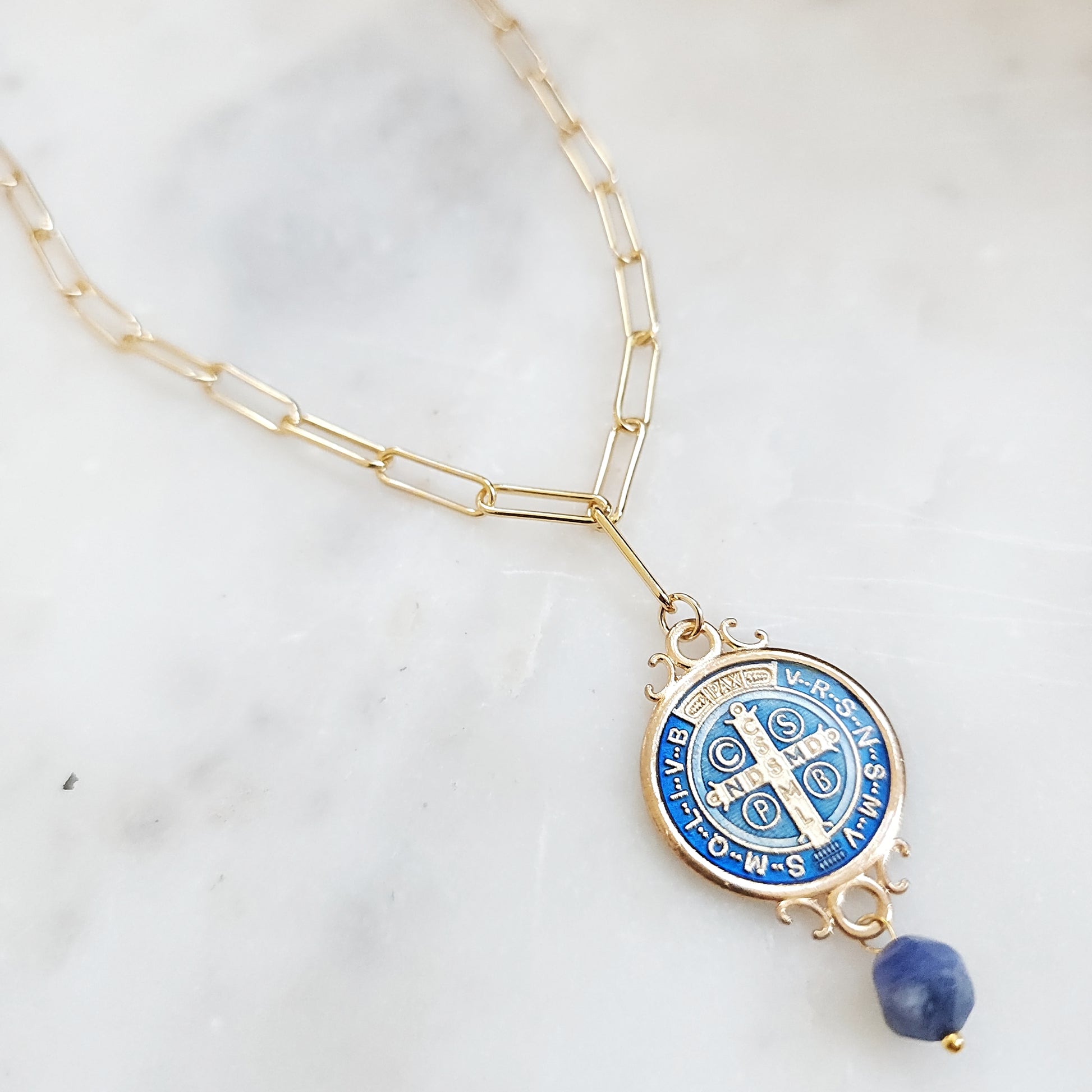 Keep the spirit of God close with this 14k gold finished paperclip chain necklace, complete with a peach in color St. Benedict charm. At 18 inches, it's a polished and stylish addition to any outfit. Invest in a versatile and stylish piece of jewelry that keeps your beliefs close. This 14k gold finished paperclip chain necklace, with the added St. Benedict charm, is a perfect addition to any outfit. At 18 inches, it adds a polished touch to your look.